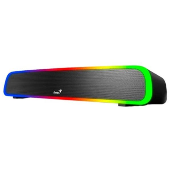 Barra de sonido con luz RGB y conectividad Bluetooth 5.1. Compatible con dispositivos a traves de Bluetooth o entrada de 3.5 mm.